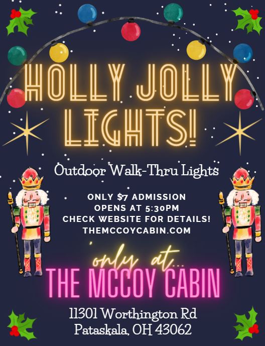 Come enjoy the Holly Jolly Lights at The McCoy Cabin. A beautiful display of Christmas lights, and character displays such as giant Nutcrackers, Angels, Reindeer, Santa and more. Walk through our famous light tunnel and take memorable pictures with your loved ones. Watch the Synchronized Light Show while enjoying a warm cup of hot chocolate and a cookie, or other food items available for purchase. All in a family-friendly environment, so you and your family and friends can enjoy a heart-warming night surrounded by the Holiday Spirit that this wonderful season brings!