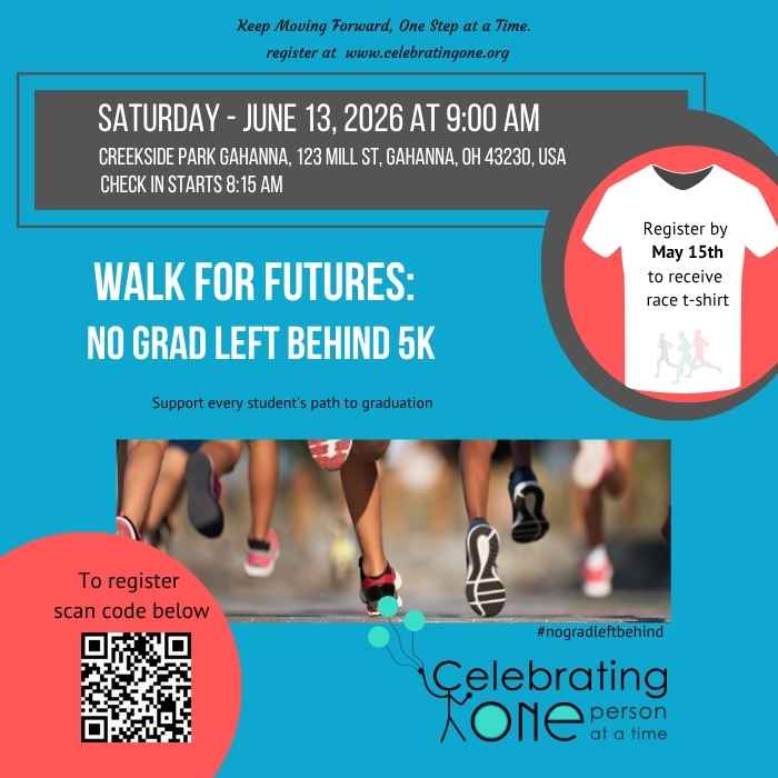 Celebrating One’s 5K Run/Walk brings the community together to support students in need through our “No Grad Left Behind” initiative, helping ensure every senior can graduate with dignity. Proceeds from the event fund caps, gowns, and essential graduation items for underserved students in Franklin County. Join us for a meaningful, family-friendly event that makes a lasting impact.