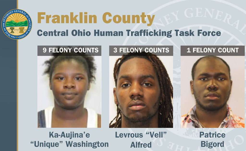 The three were indicted by a Franklin County grand jury on May 24 on a total of 13 human trafficking-related charges and were arrested Tuesday by the U.S. Marshals Service, Ohio Attorney General Dave Yost announced.