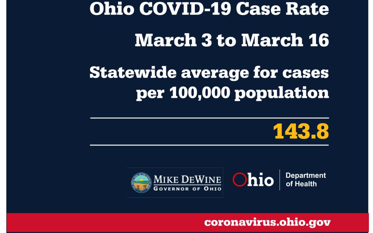 Newly released state Health Department figures indicate that Ohio has dropped to 144 cases per 100,000 people as of Thursday. When Ohio reaches 50 cases per 100,000 people for two weeks, DeWine has promised the orders would be rescinded.