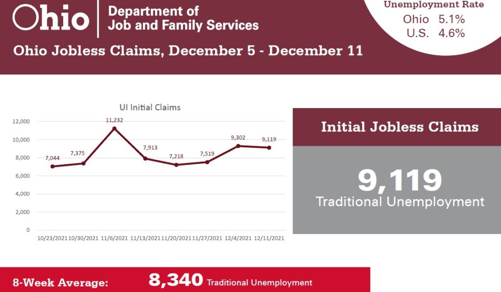 The state reported that 9,119 people filed initial claims during the week that ended Dec. 11, a 2% drop from the week before, and the total number of claims the department processed during the week declined 1.7%.