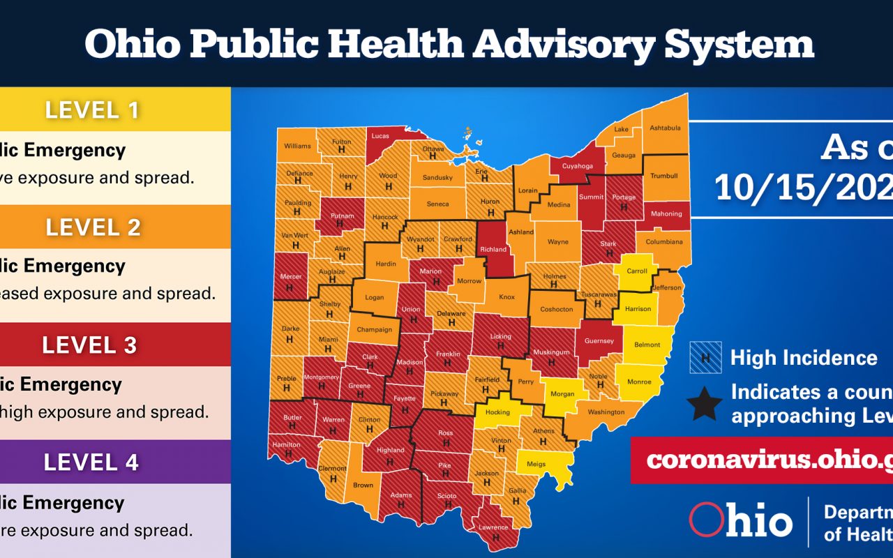 Franklin, Licking, Madison and Union counties in central Ohio were among 13 counties upgraded to Level 3 on the state’s four-tiered public health advisory system, a “red tide” washing over the state, according to DeWine.