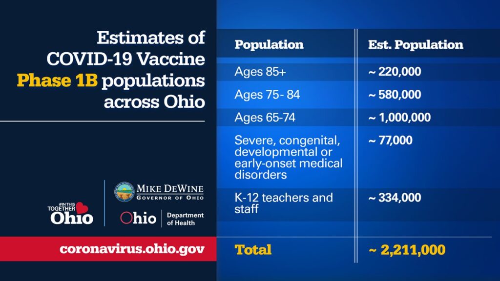 Vaccinations for Ohioans with severe congenital, developmental, or early onset medical disorders will also be available the week of Jan. 25 and details about distribution for that group will be announced later, DeWine said.