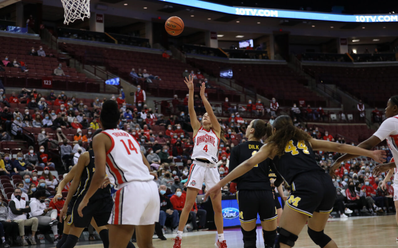 COLUMBUS – No. 22/19 Ohio State fell behind early and never caught up in a 77-58 loss to 7th-ranked Michigan in a Big Ten women’s basketball game at Value City Arena Thursday night.