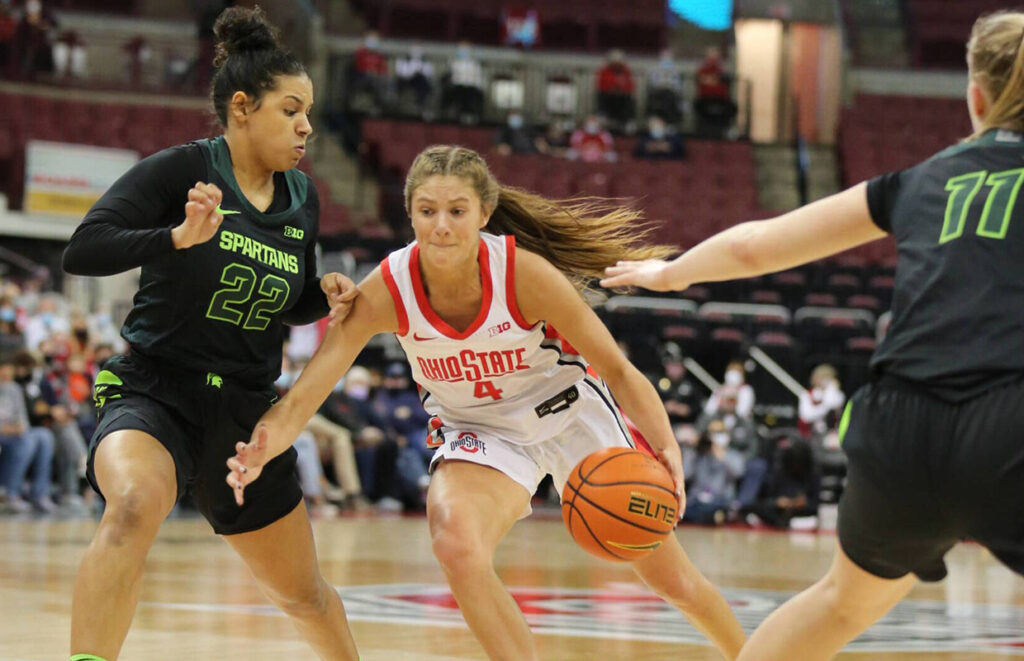 Trailing 27-18 at the end of the first quarter, Ohio State used a 9-0 run to get back within one and retook the lead, 33-32, on a three-pointer from Gabby Hutcherson and ended up outscoring the Spartans (8-8, 2-3) 28-8 to lead 46-35 at halftime.