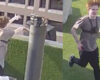 Columbus police are looking for a suspect, possibly as young as 14, who climbed to the roof of a downtown condominium building and pushed a large speaker off the roof to a patio several floors below.